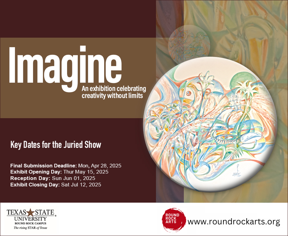 | Submission Fee: $30.00 for up to 3 pieces of art for jury selection. Location: the Avery Building on the Texas State University Round Rock Campus. Important Dates: Reception date Sunday Jun 01, 2025 from 2 pm – 4 pm Submissions Close on Monday Apr 28, 2025 at 11:00 pm Acceptance Notifications Emailed on Monday May 05, 2025 Drop Off Art on Monday May 12 from 2 pm – 4 pm Show Opens on Thursday May 15, 2025 Show Closes on Sat Jul 12, 2025 Pick Up Art on Sunday Jul 13, 2025 By submitting an entry to this exhibition, you are agreeing to arrange for your art to be dropped off and picked up in person at the dates and times above. |